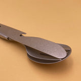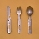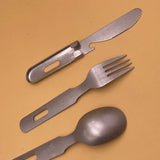 Astucieux et pratique : la cuillère et la fourchette s’emboîtent parfaitement dans le manche du couteau, qui intègre également un décapsuleur. Un design intelligent qui en fait le compagnon parfait pour le camping, les pique-niques, ou simplement vos déjeuners au bureau.