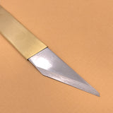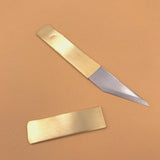 L'étui, qui est aussi le manche, est en laiton. Le couteau est donc assez lourd et offre un excellent contrôle. Il est tout plat et est facile à emporter partout.