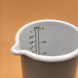 Astuce : le pichet doseur en émail peut également être utilisé pour mesurer précisément un liquide chaud tel que du lait (ou de l'eau) pour la pâte à levure ou du bouillon pour risotto. Cependant, il ne doit être utilisé que sur un feu à petit diamètre car le fond du pichet est étroit. Si vous réchauffez du lait, assurez-vous d'ajouter un peu d'eau pour empêcher le lait de brûler.