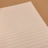 Chaque cahier contient 32 feuilles de papier crème 85g qui sont reliées au point pour une durabilité accrue. Les lignes espacées de 7 mm sont imprimées à l'encre Vermilion, offrant une expérience d'écriture unique. Le papier est sans acide, résiste aux stylos plume et est extrêmement facile à utiliser avec un stylo à bille. La couverture en papier épais est d'inspiration vintage, avec le logo emblématique de L!FE.