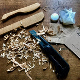Note : un couteau ou outil tranchant type cutter est nécéssaire pour sculpter le morceau de bois mais il n'est pas inclus. Nous vous conseillons un couteau de poche assez tranchant ou, dans l'idéal, notre couteau utilitaire "Kiridashi".