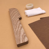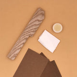 Le kit contient un bloc de cyprès Japonais "Hinoki" de forme brute à sculpter ainsi que trois types de papier de verre, de la cire d'abeille et du tissu.