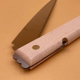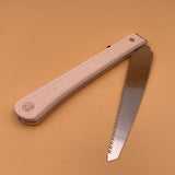 Une jolie scie à élaguer pliable pour les petits travaux de coupe dans le jardin, avec un manche en hêtre de forme spéciale et un simple dispositif de verrouillage pour maintenir la lame en place.