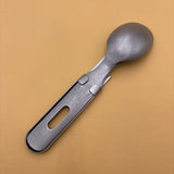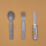 La cuillère et la fourchette s’emboîtent parfaitement dans le manche du couteau, qui intègre également un décapsuleur. Un design ingénieux, pensé pour accompagner le quotidien nomade : camping, pique-niques ou déjeuners au bureau.